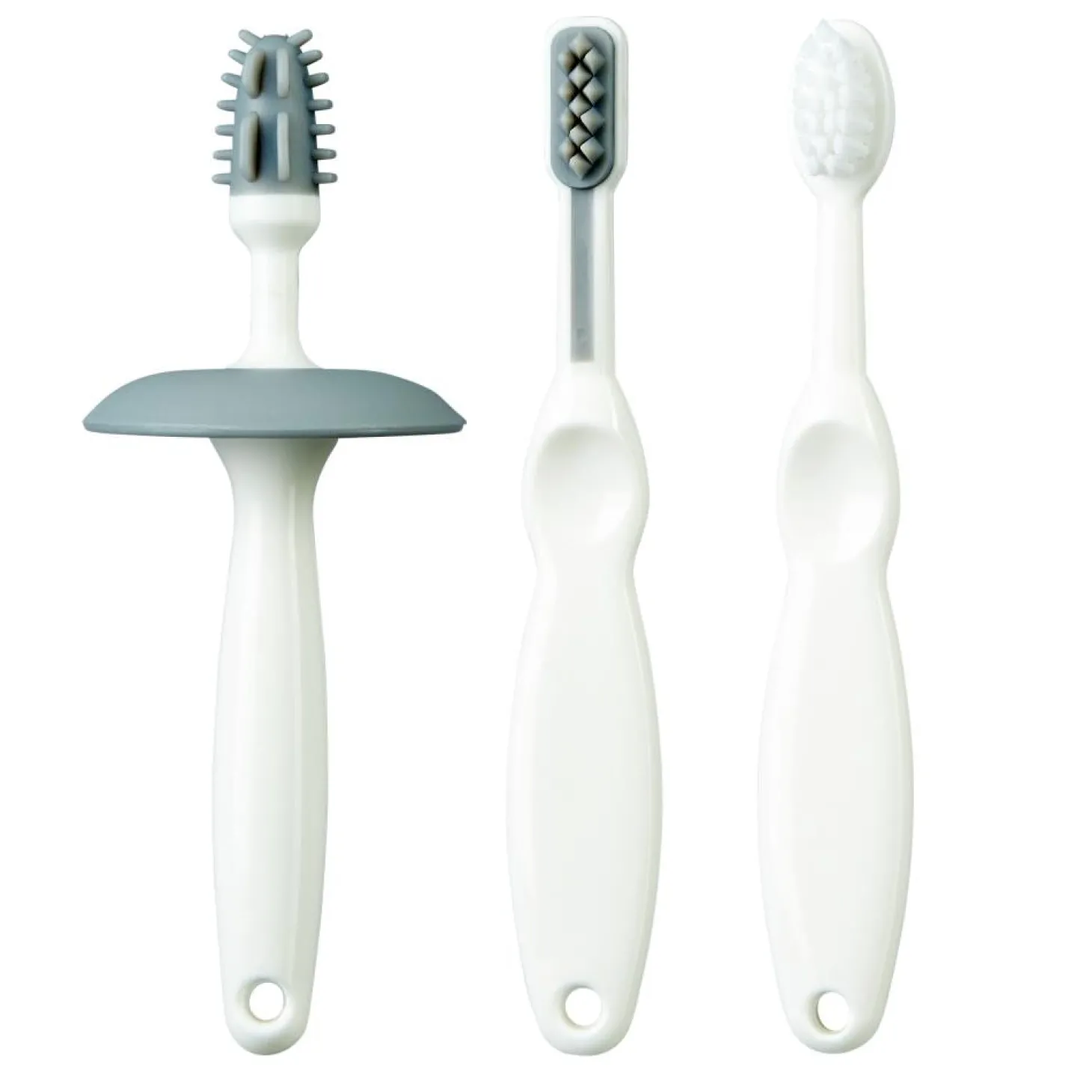Mininor tandbørstesættet leveres med 3 forskellige typer børster, hver med sin egen fordel, der giver dig mulighed for at øve dit barns tandbørstningsrutine i 3 trin: