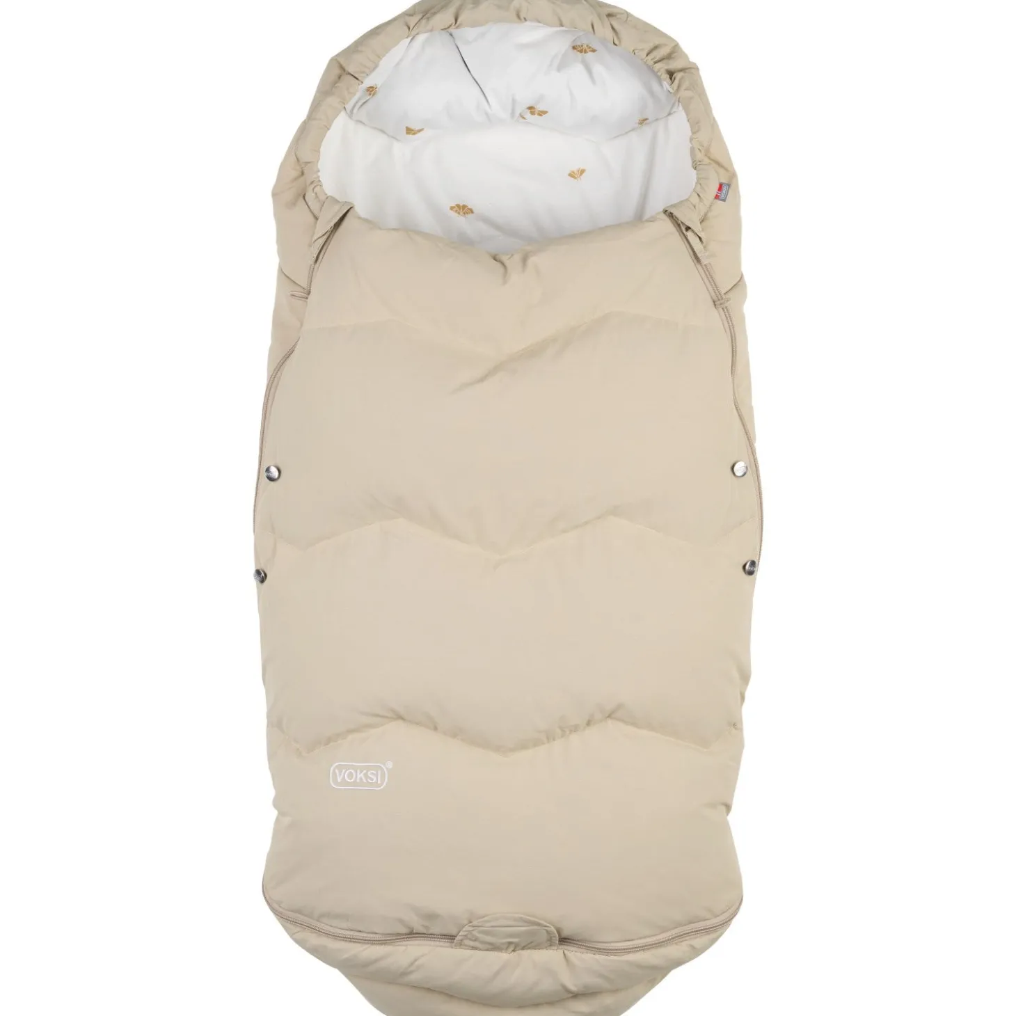 Voksi Seashell Sand Explorer er fremstillet af højkvalitetsmaterialer, herunder blødt ande- og dunfyld kombineret med åndbar uldpolstring, som sikrer behagelig temperaturregulering i enhver situation. Med en smart lynlåsåbning ved fødderne og en emergenslynlås, er denne kørepose både praktisk og sikker i brug.